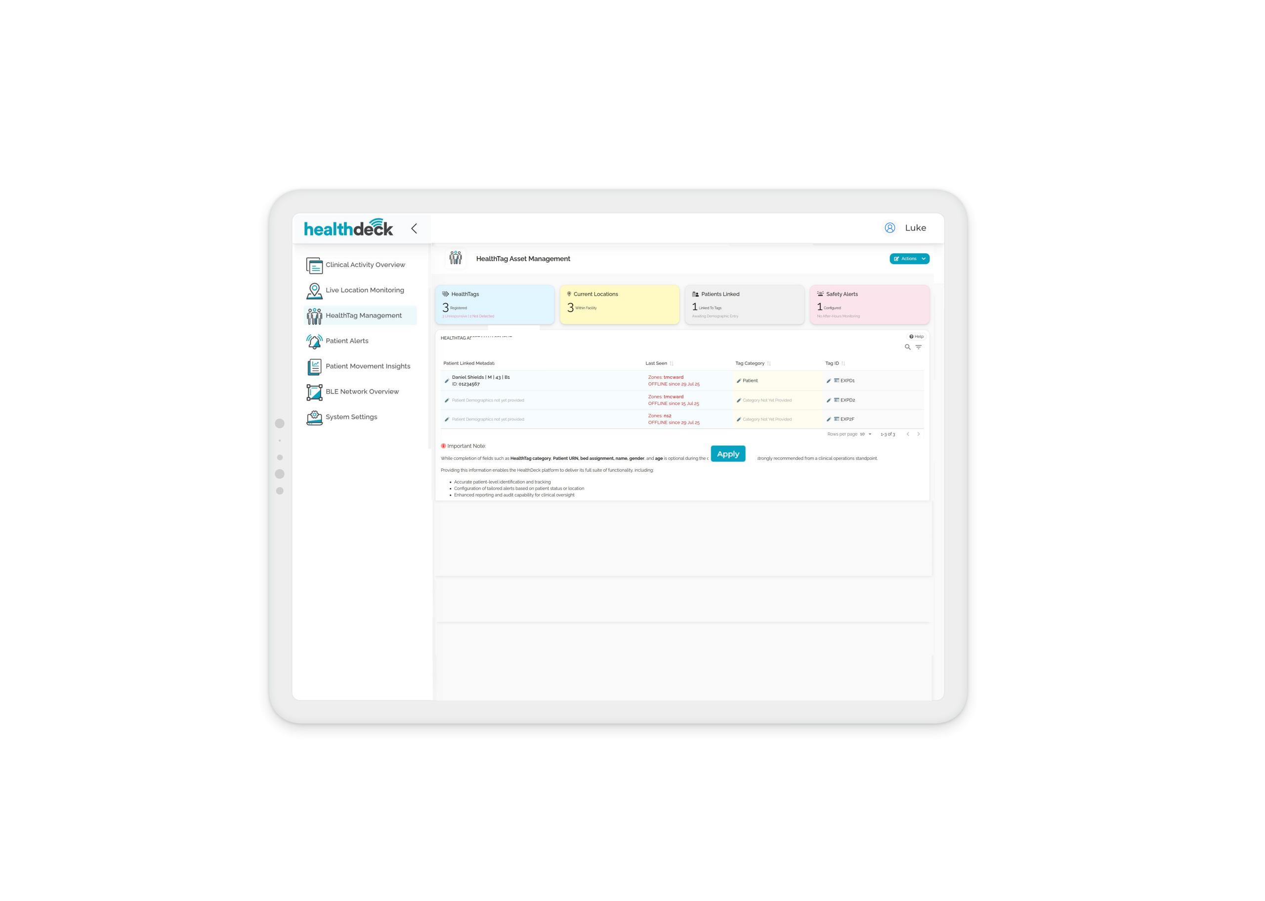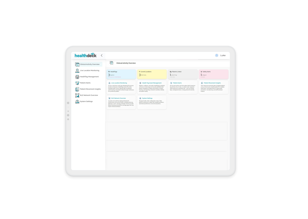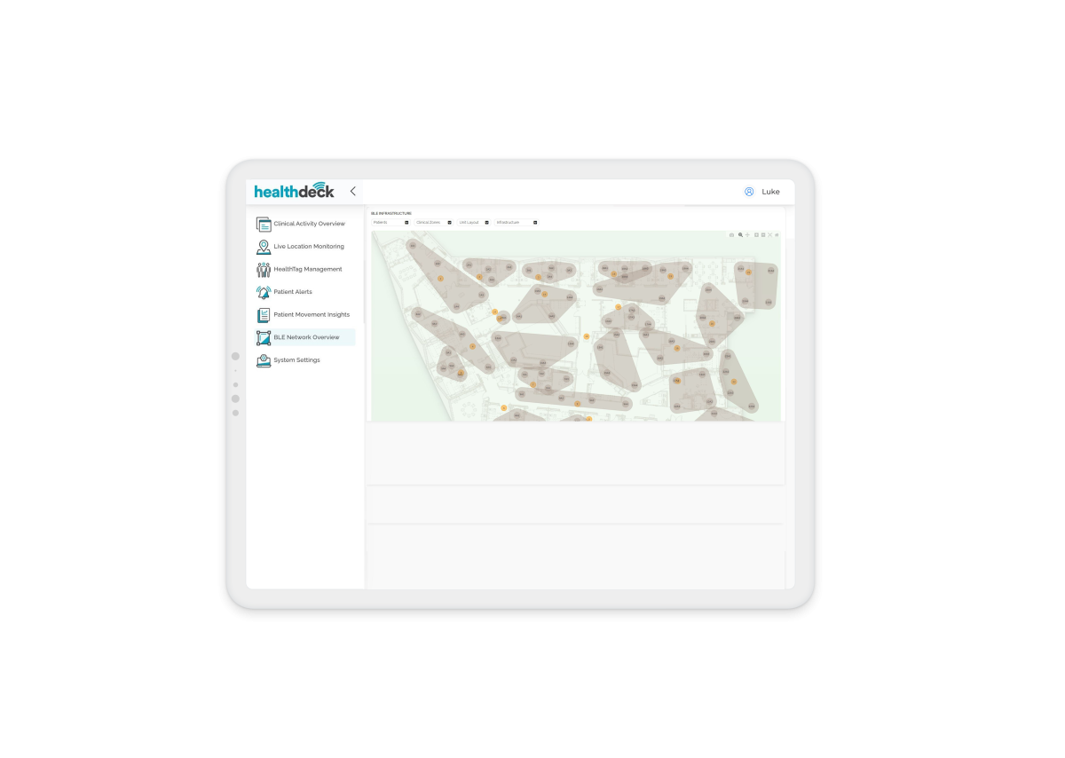 All data from CareTrack and our thermal sensors is available instantly on a user-friendly dashboards, roviding nurses and clinicians with a holistic view of patient mobility patterns so that they can make imely, informed decisions about care in real time. By working natively with Bluetooth access points and leveraging AI-enhanced RRM for reliable performance in RF-dense hospital environments, clinicians can access all data and alerts instantly via the Healthdeck dashboard, empowering timely, informed decisions that improve patient